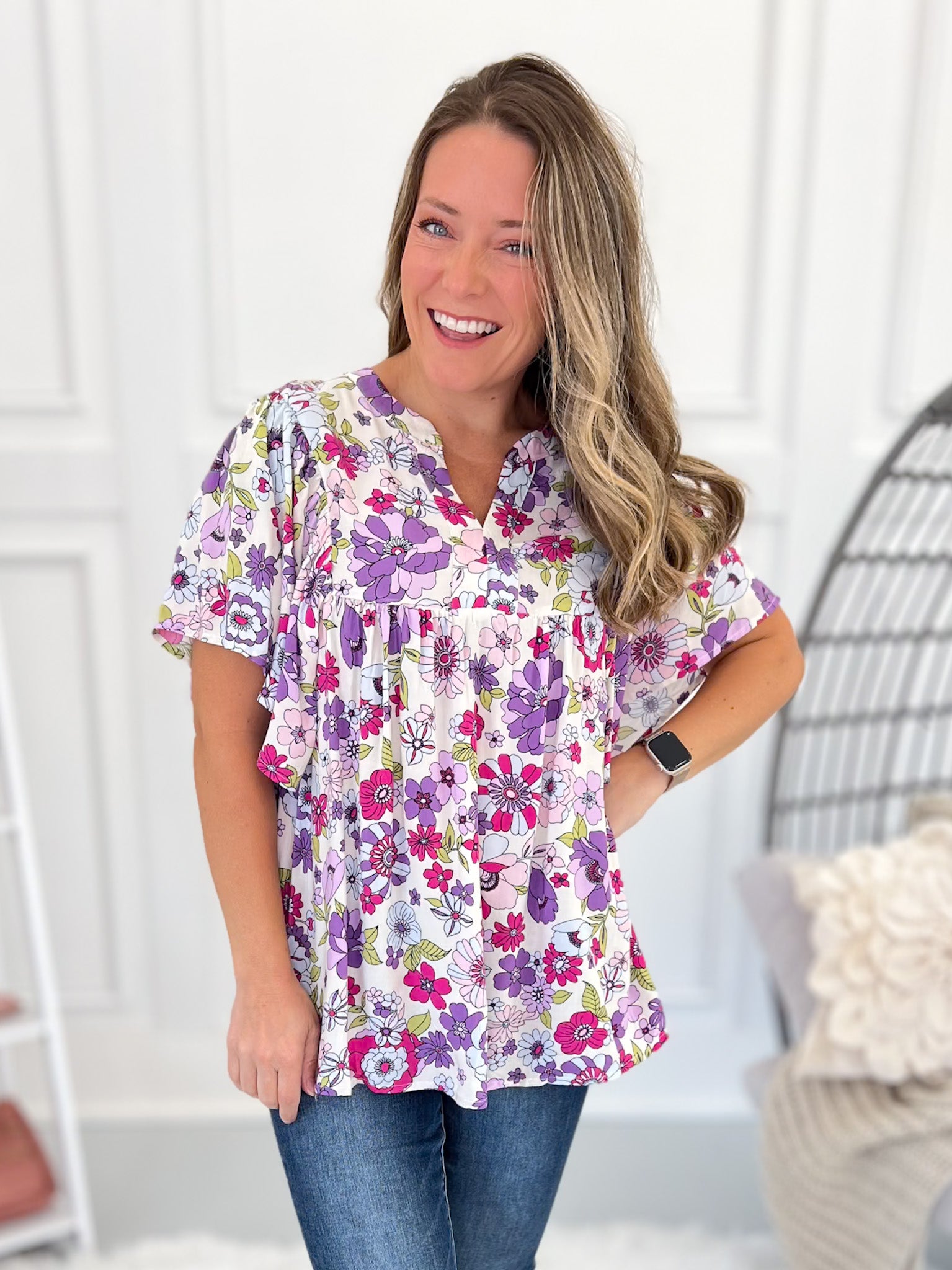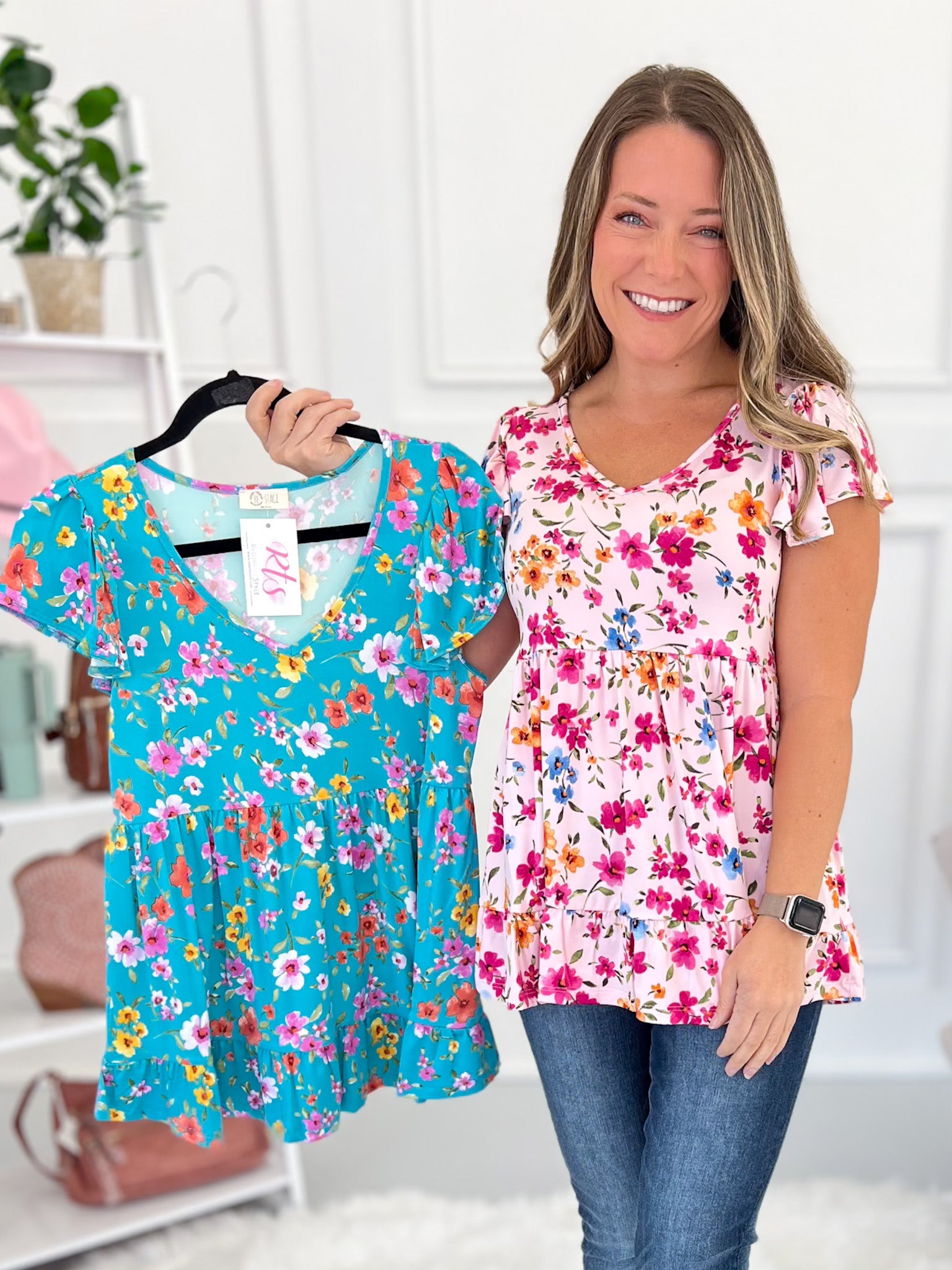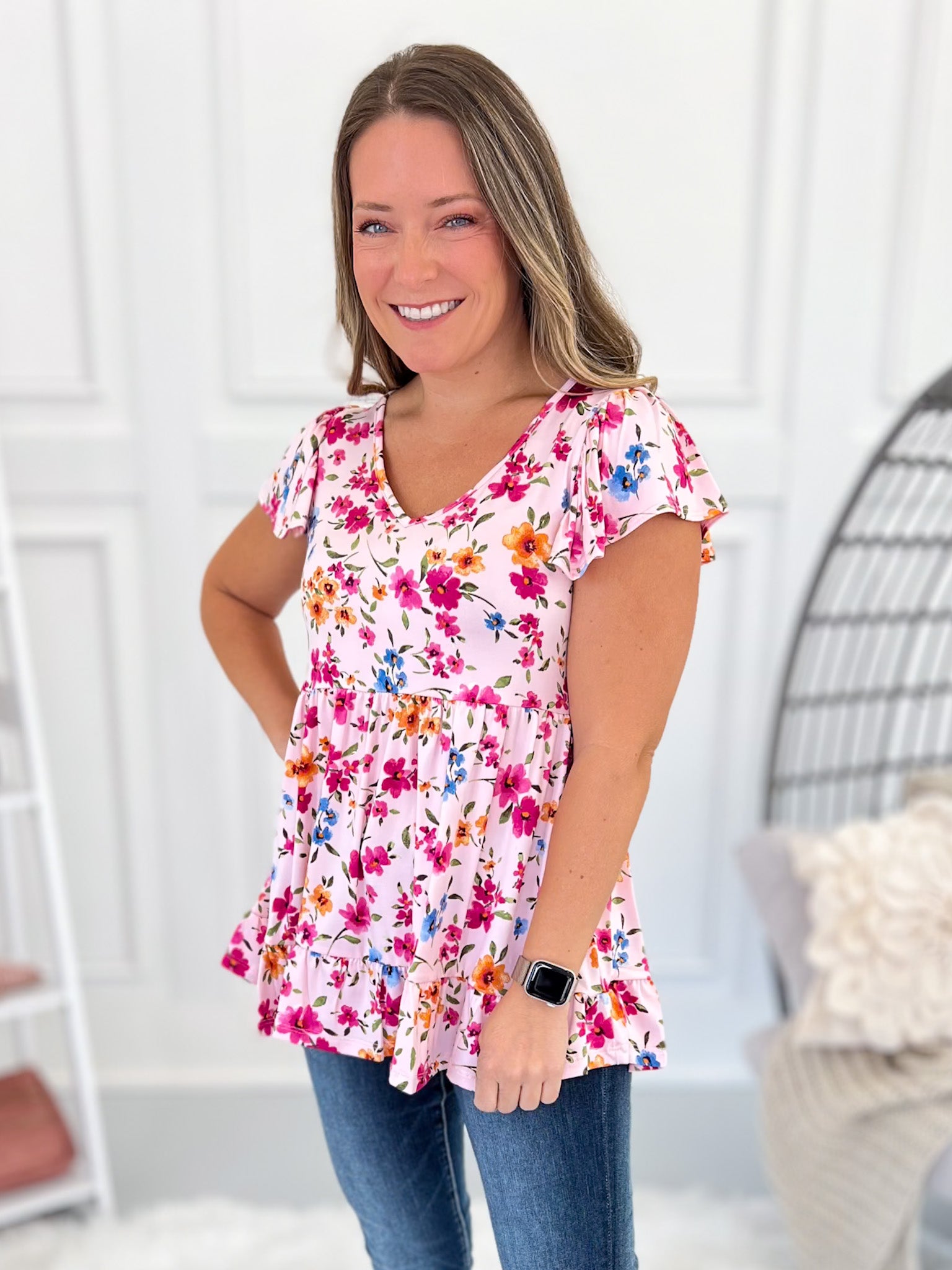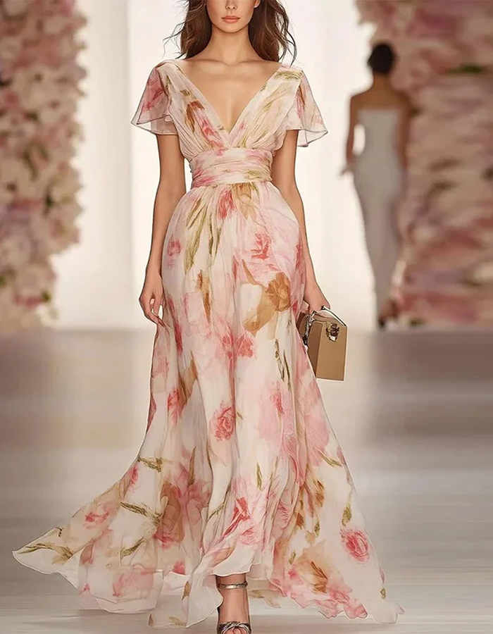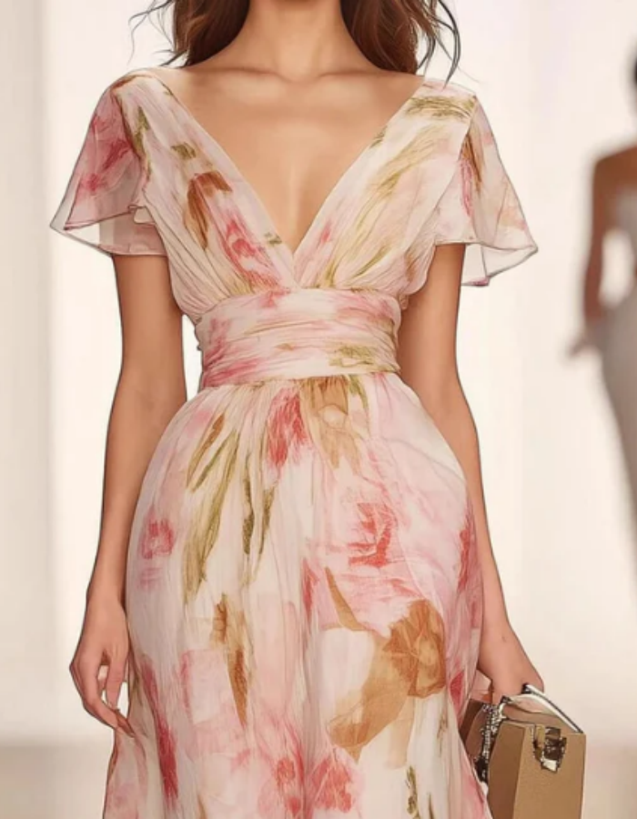 Romantic Pink Chiffon Gown with Watercolor Floral Print and Flutter Sleeves
