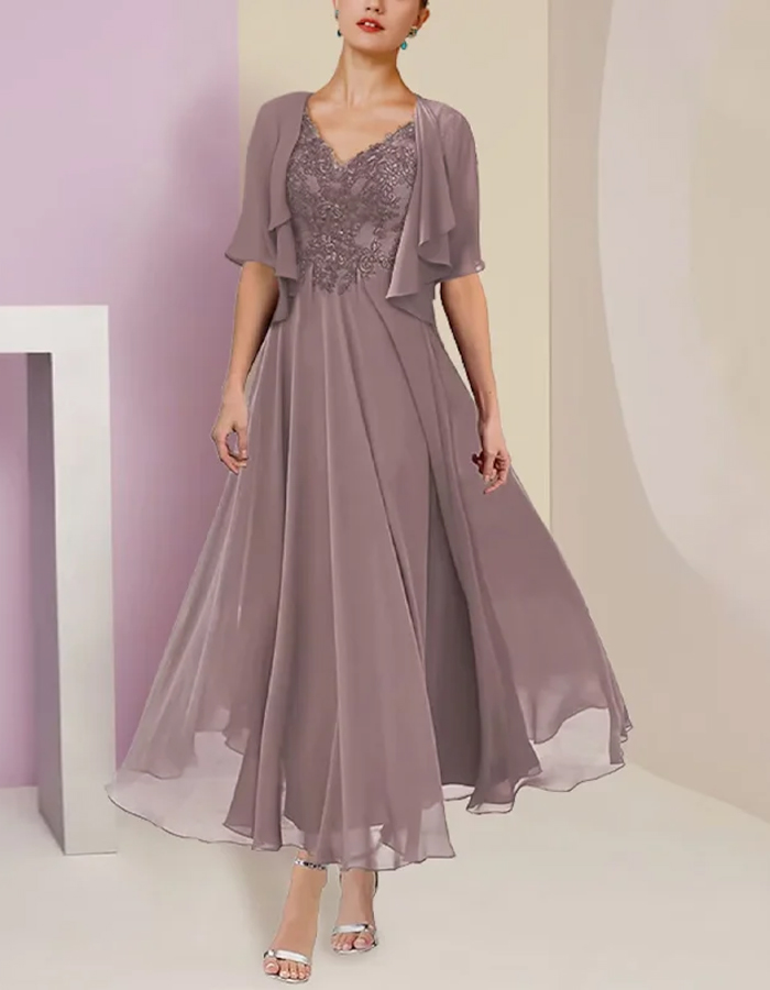 Sequined Pink Brown V-neck Short Sleeve Chiffon Dress Set
