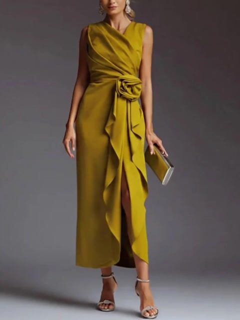 Sophisticated Satin Midi Dress with Draped Bodice and Floral Waist