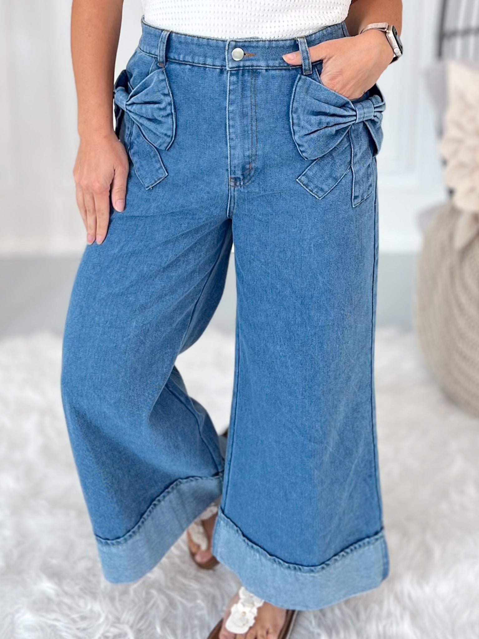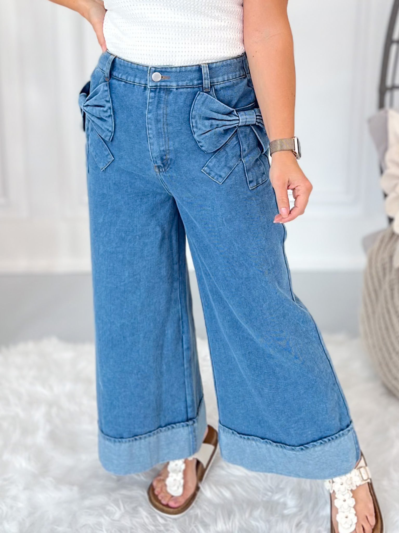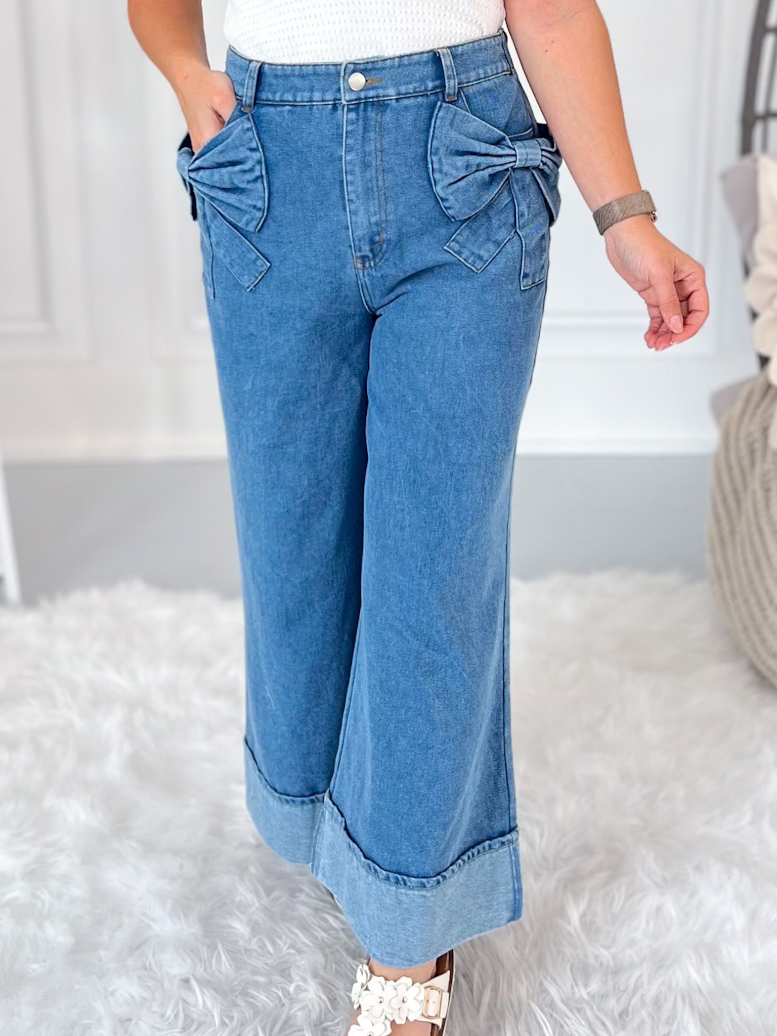 Cute, comfy, and totally unexpected—these wide leg denim pants bring the charm with oversized bow pockets and an effortless cropped fit. The elastic back waistband gives you all the comfort you want, while the wide cuff and no-distressing finish keep things polished and playful. Perfect for brunch dates, market strolls, or anytime you want to stand out in style.