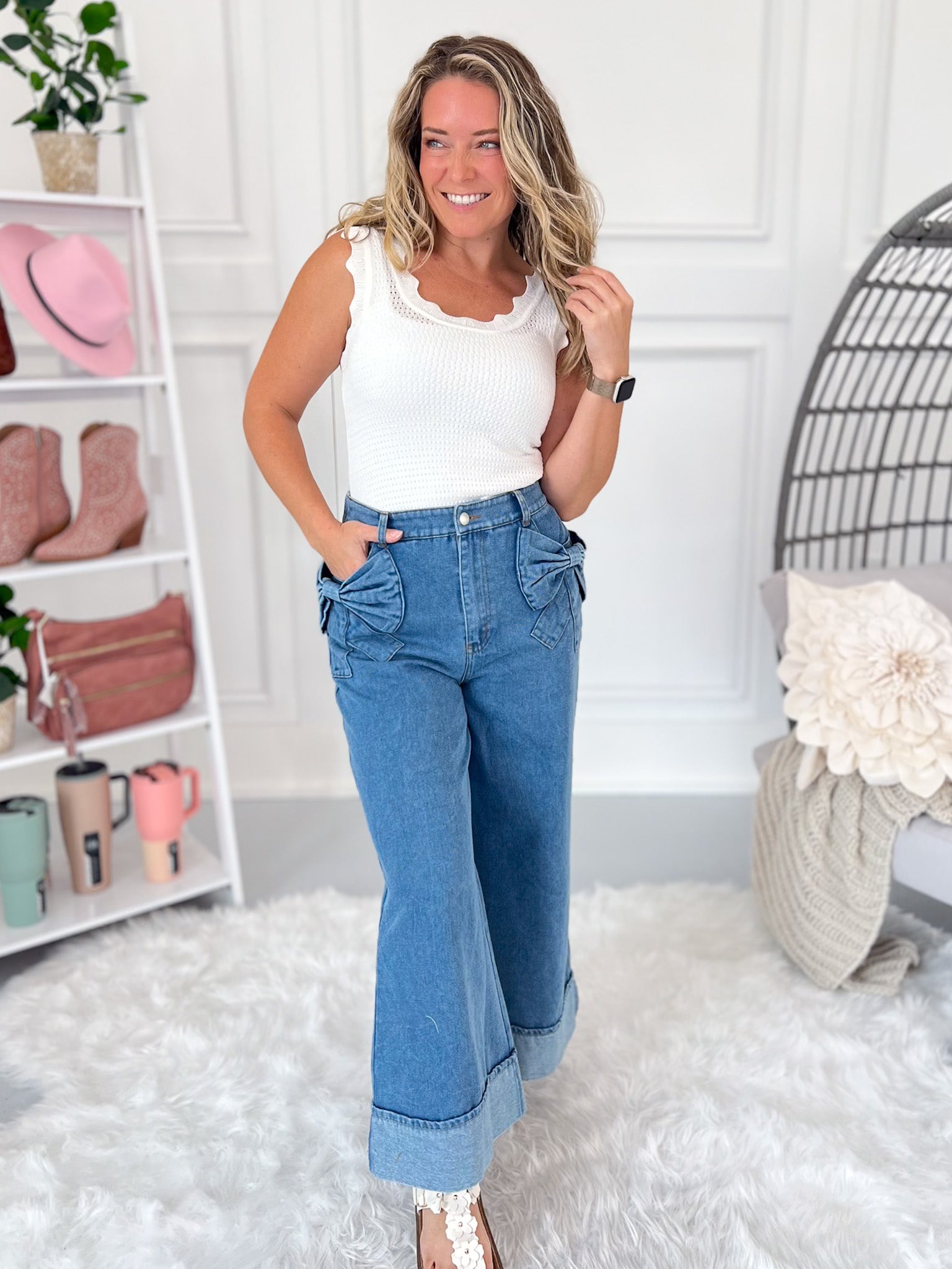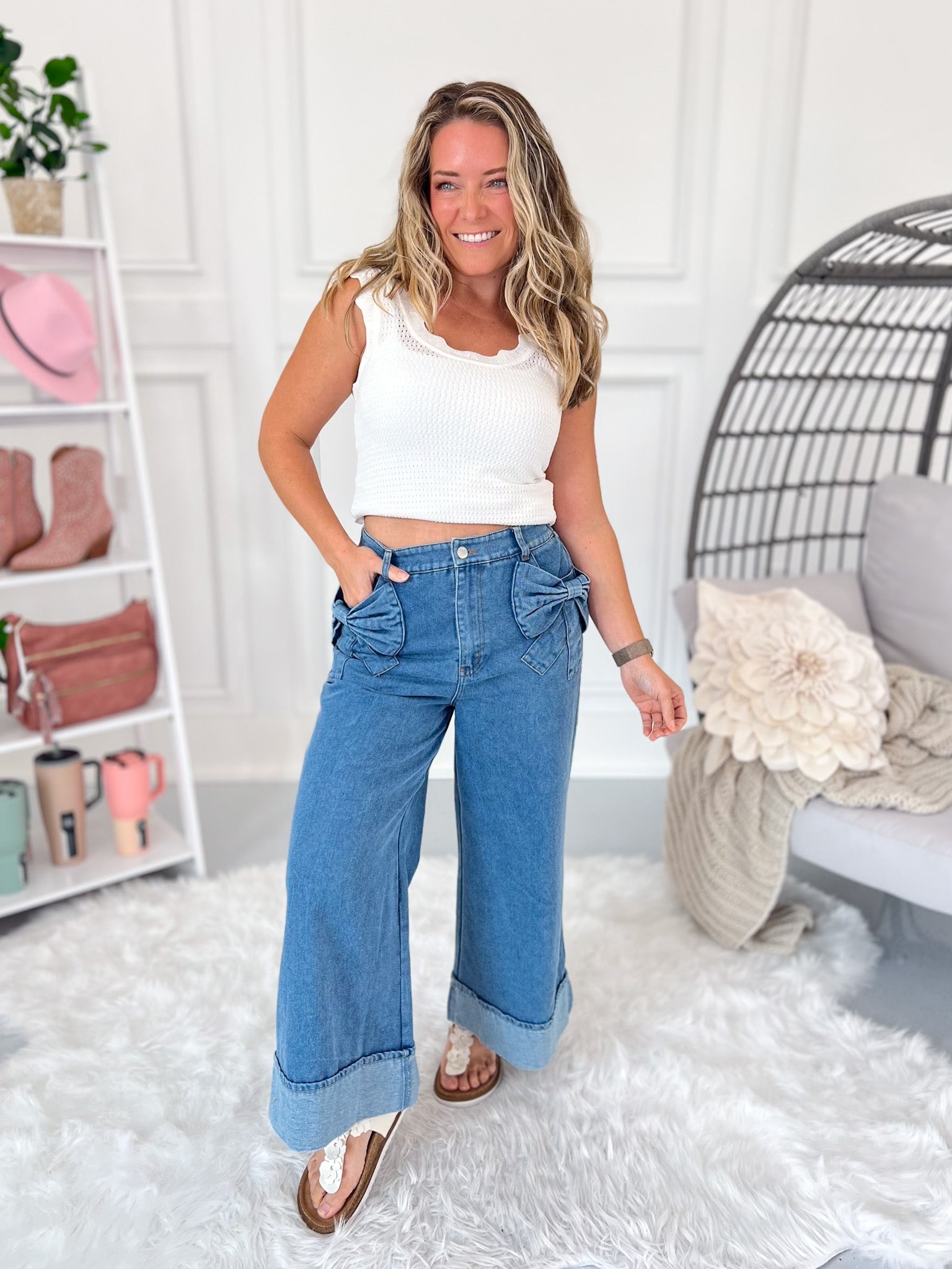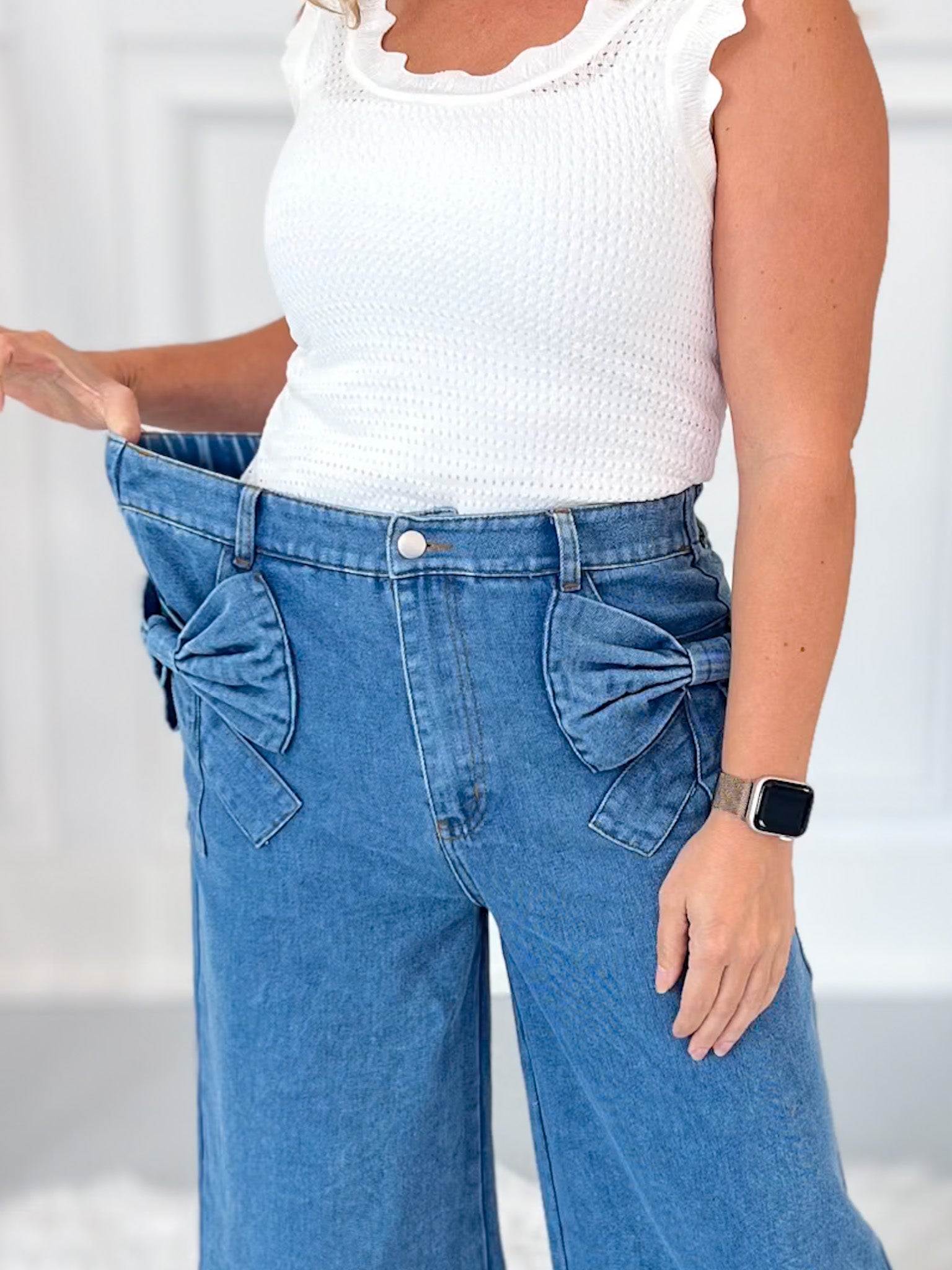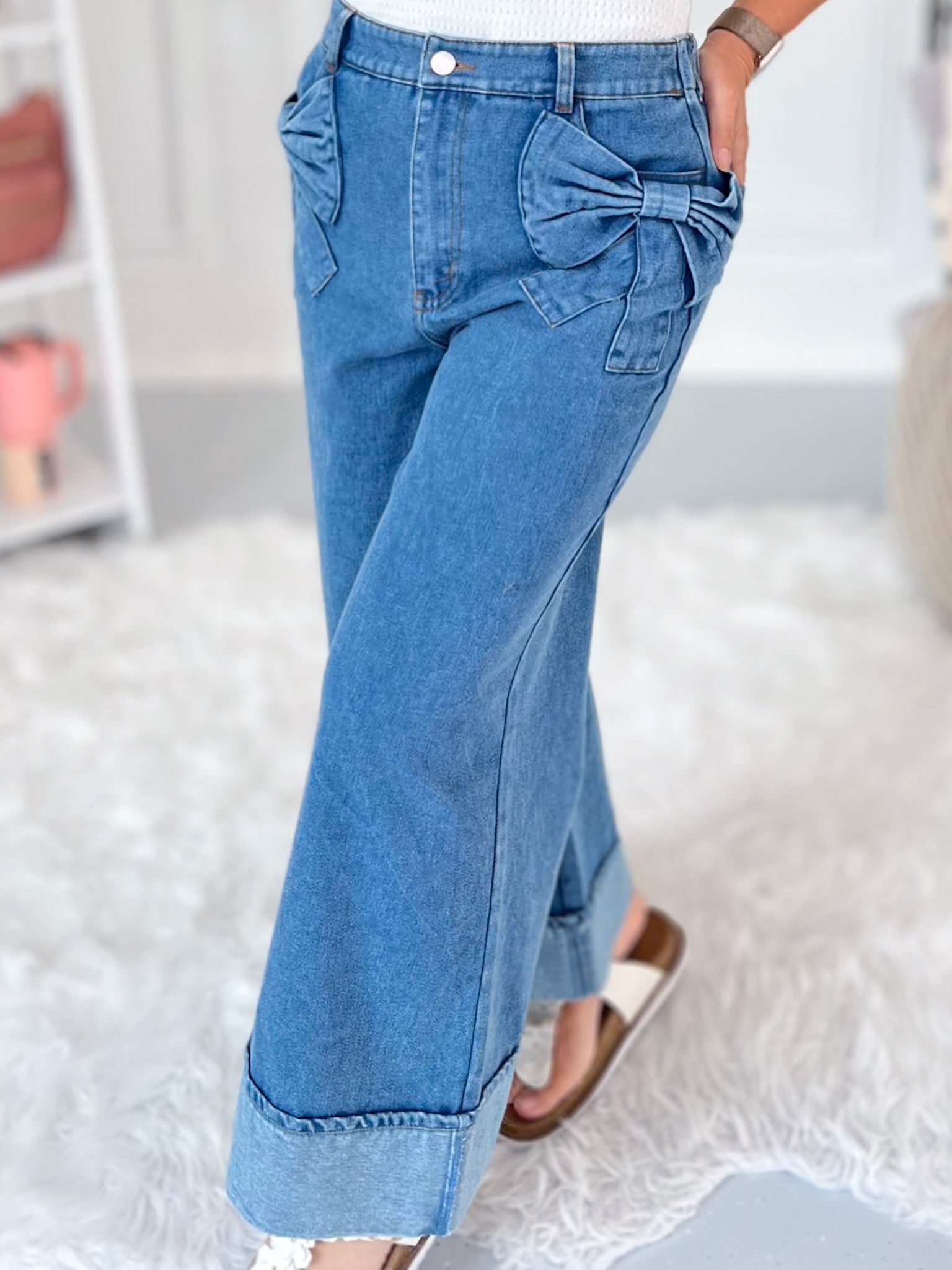 Cute, comfy, and totally unexpected—these wide leg denim pants bring the charm with oversized bow pockets and an effortless cropped fit. The elastic back waistband gives you all the comfort you want, while the wide cuff and no-distressing finish keep things polished and playful. Perfect for brunch dates, market strolls, or anytime you want to stand out in style.
