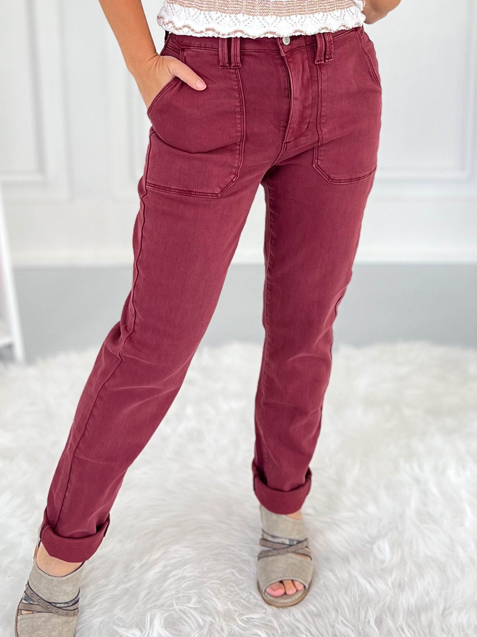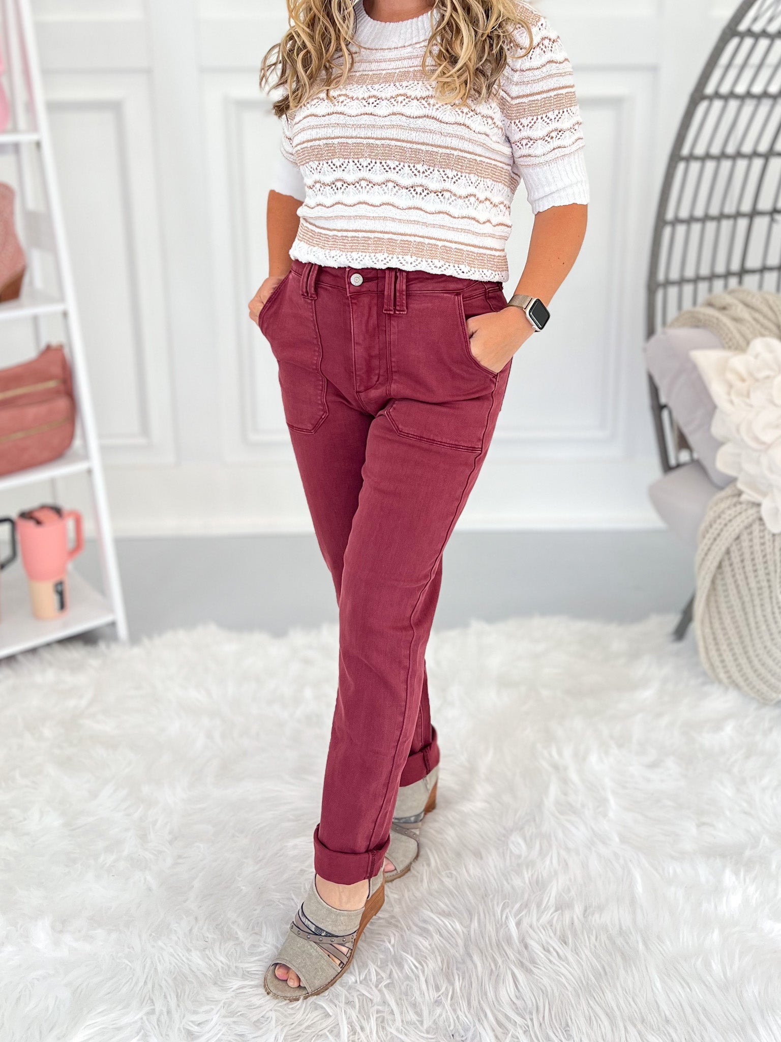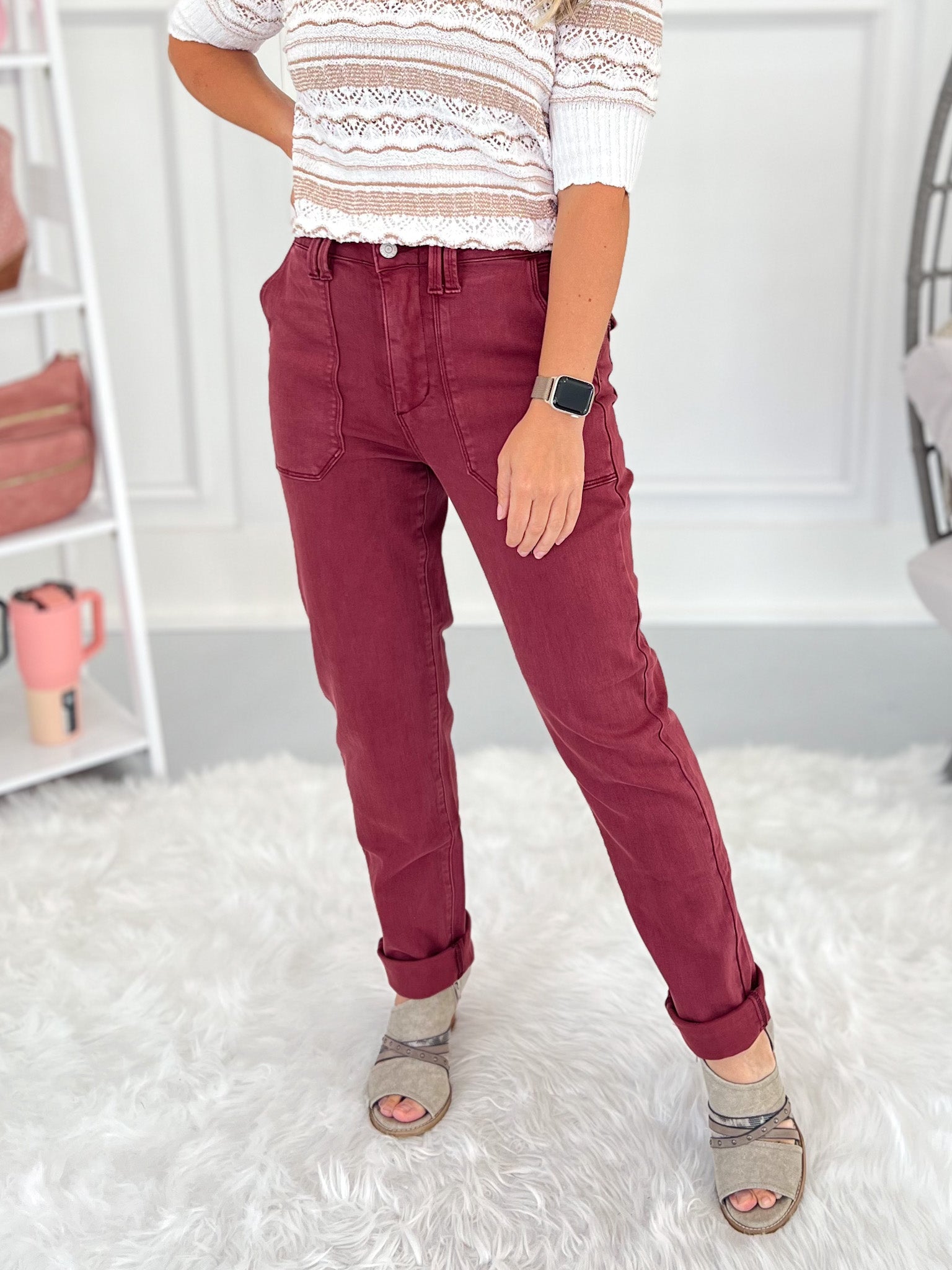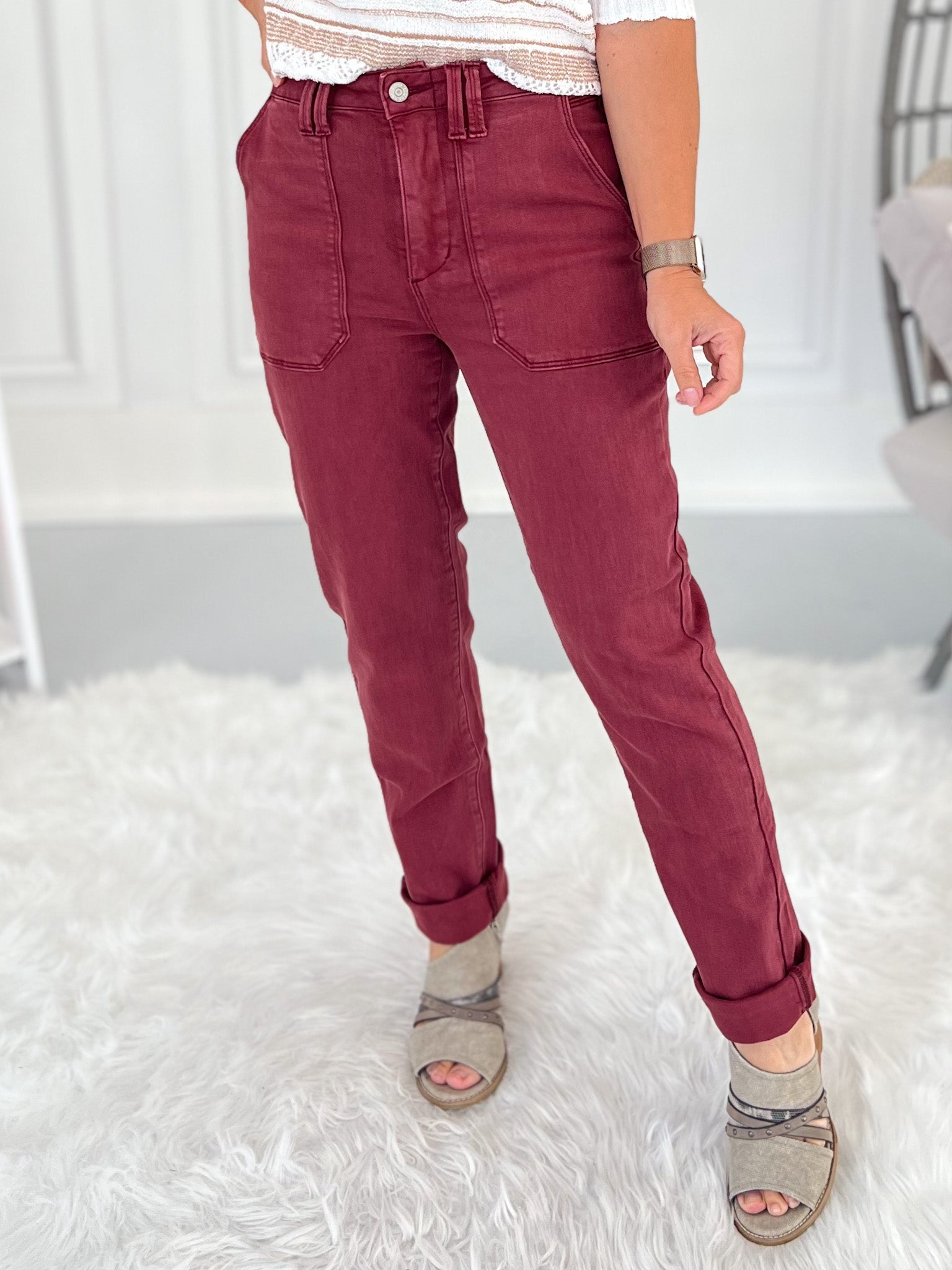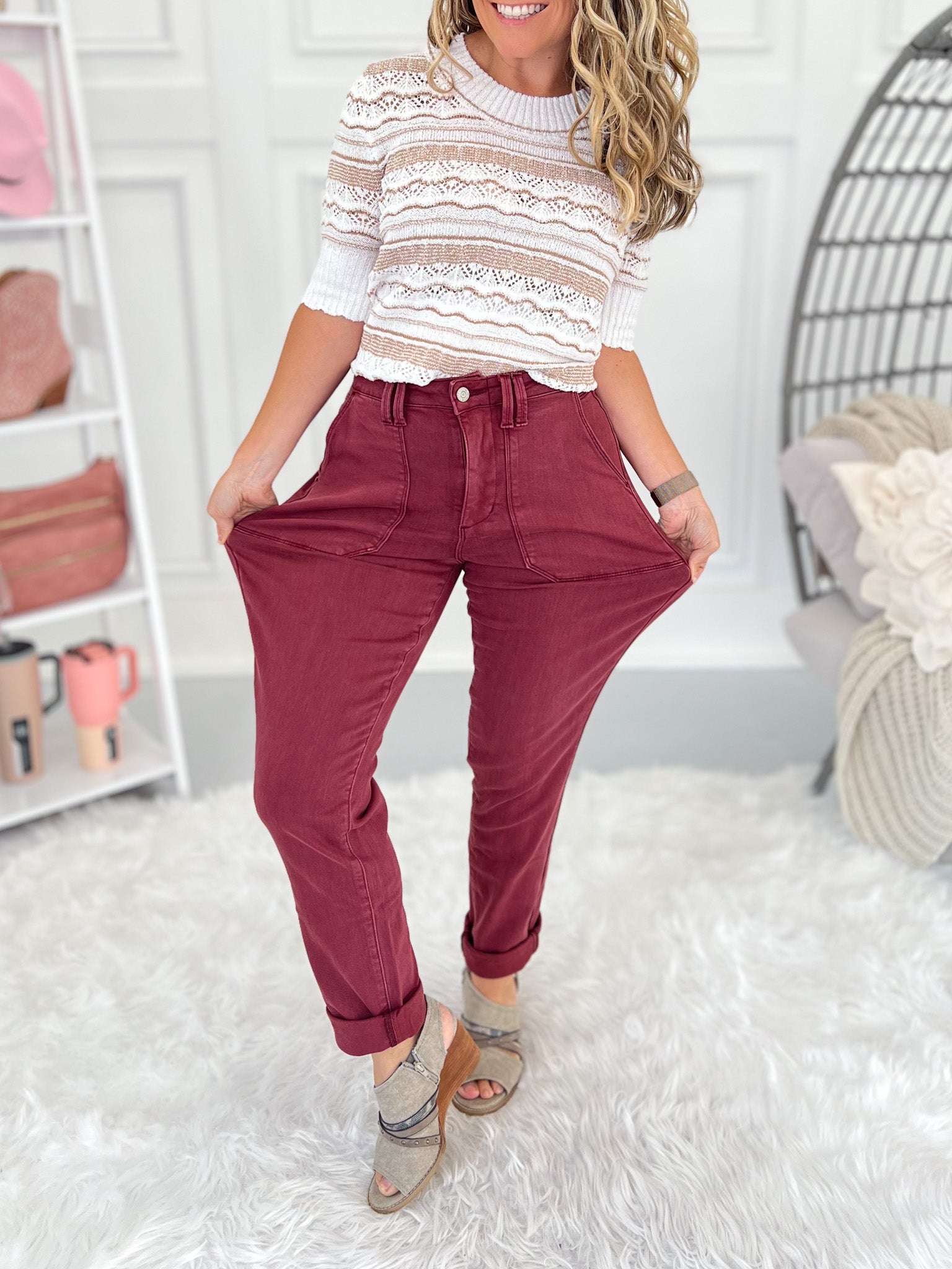 This new Judy Blue fit brings cozy fall color and elevated comfort together in the most flattering way. With that smooth waistband (bye bye drawstring!) and non-pucker jogger-style pocket, these burgundy beauties go from errands to office with zero effort. They’re soft, stretchy, and the fit has been perfected to give a relaxed and care-free feel without any bulk or bagginess in the leg. You're going to LOVE this new look from Judy Blue!