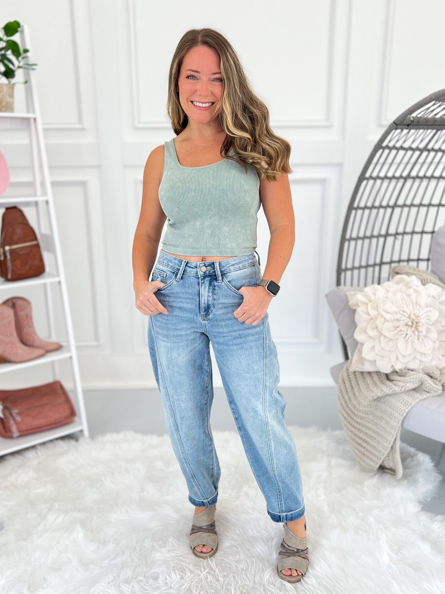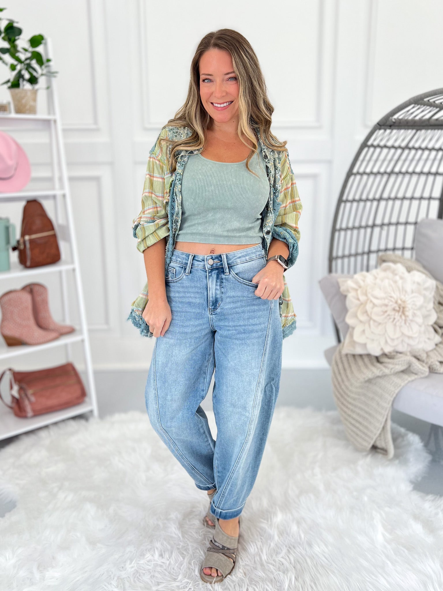 Set the tone for effortless cool with these subtle barrel jeans. They're relaxed without feeling sloppy, polished without being stuffy. Whether you're running errands or meeting the girls for brunch, these jeans bring major trend points with zero extra effort needed. They look so cute cuffed with a tennis shoe, or wear them uncuffed with a heel and blazer for a more dressy vibe.