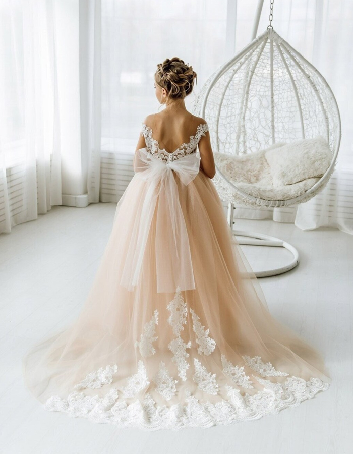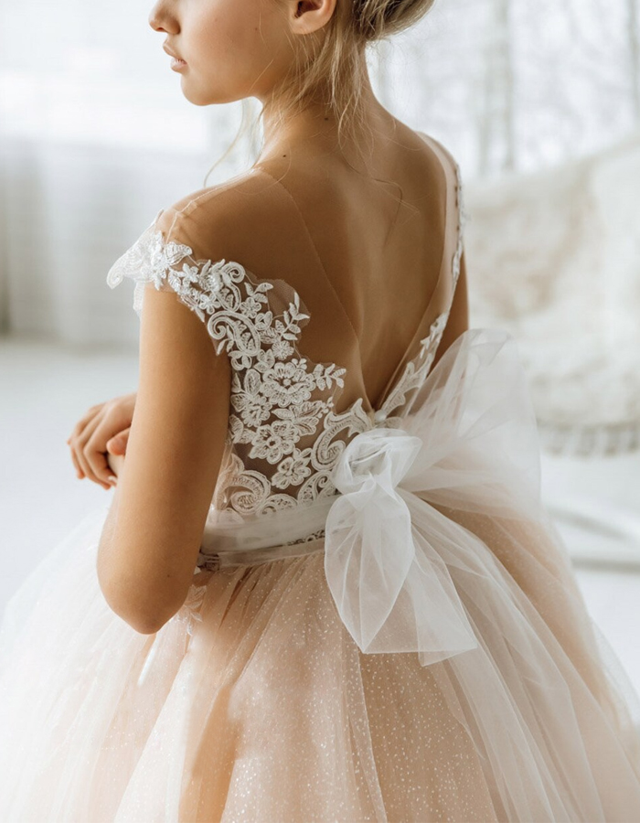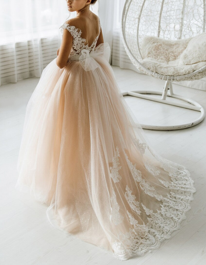 This gown is a paragon of elegance and romance. The off - shoulder design reveals a hint of the shoulder, adding a touch of allure. The bodice is intricately adorned with delicate lace patterns, showcasing fine craftsmanship. The voluminous tulle skirt is not only airy and flowing but also sprinkled with subtle sparkles, creating a dreamy and fairy - like effect. It's a perfect choice for flower girls to make a grand and enchanting entrance at weddings or upscale celebrations.