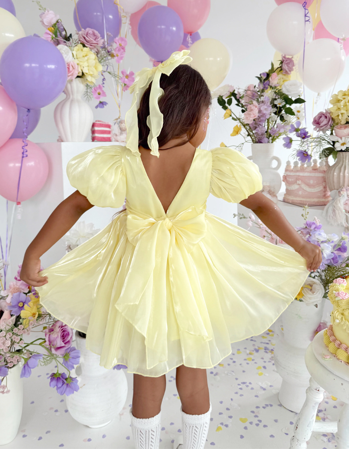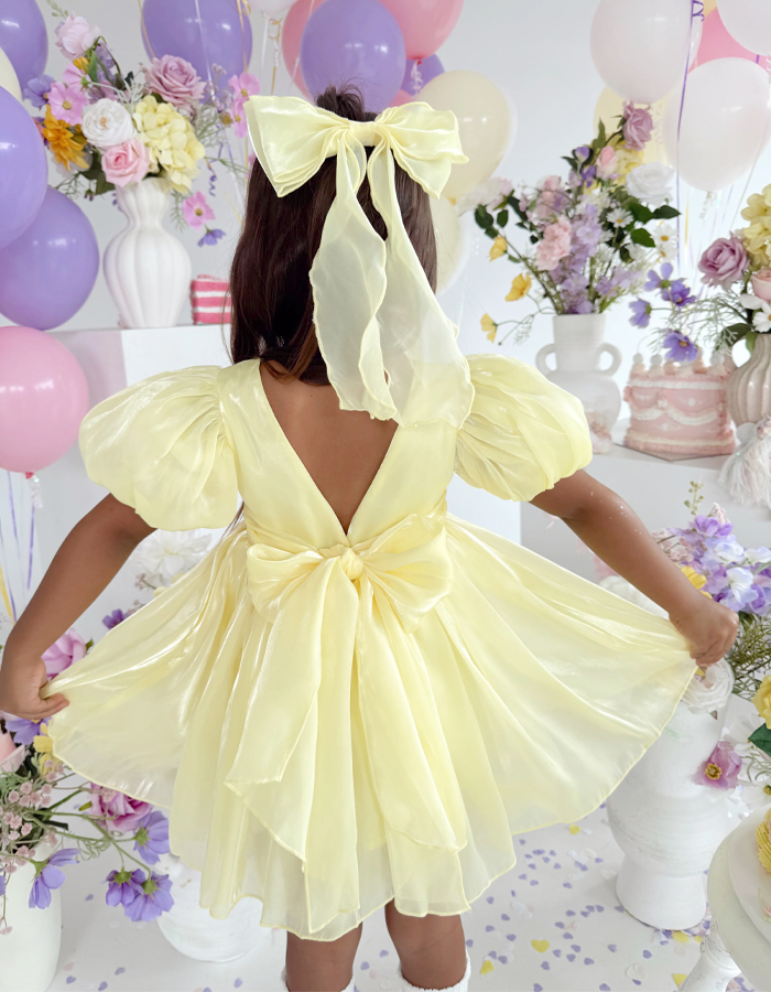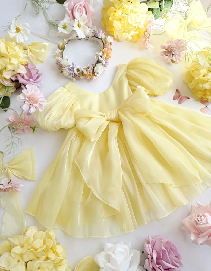 This dress radiates cheerfulness and charm. The round - neck bodice is paired with short, puffy sleeves that add a playful element. The skirt is made of a shiny, flowing fabric, giving it a full and flared silhouette. A large, eye - catching bow at the waist and another at the back enhance the dress's appeal, while the deep V - back design adds a touch of elegance. Ideal for flower girls, it's perfect for adding a bright and lovely touch to weddings or special events.