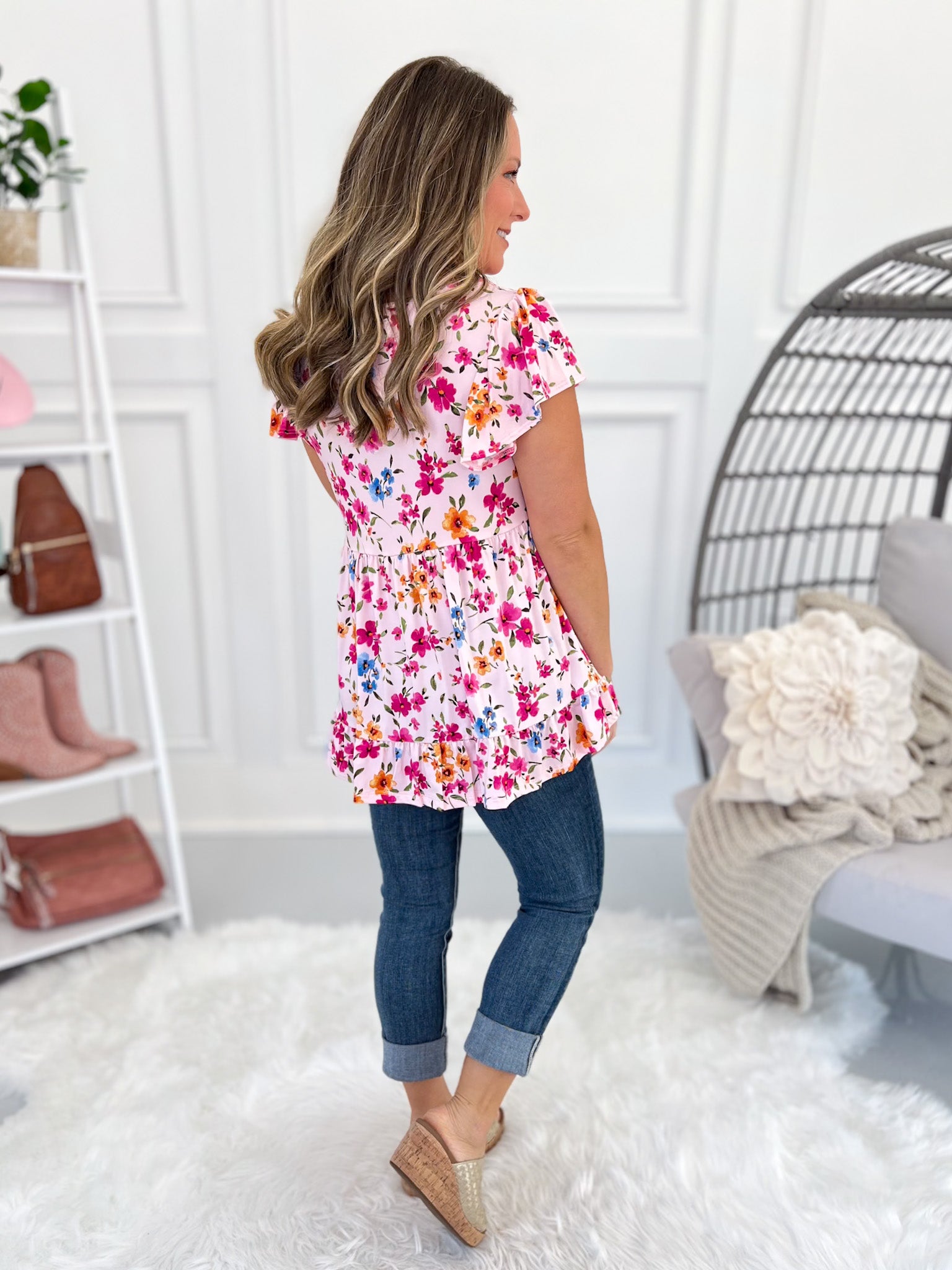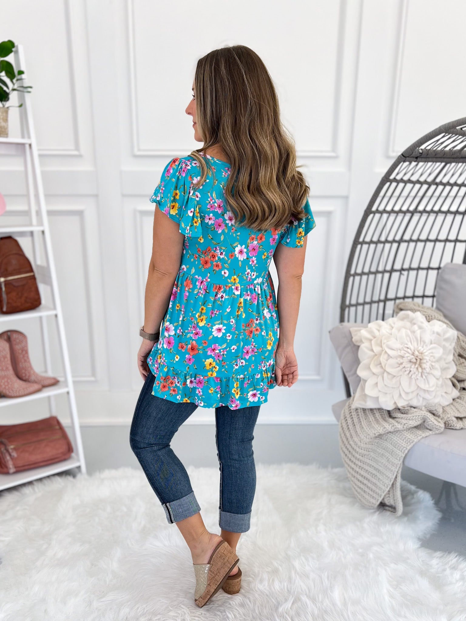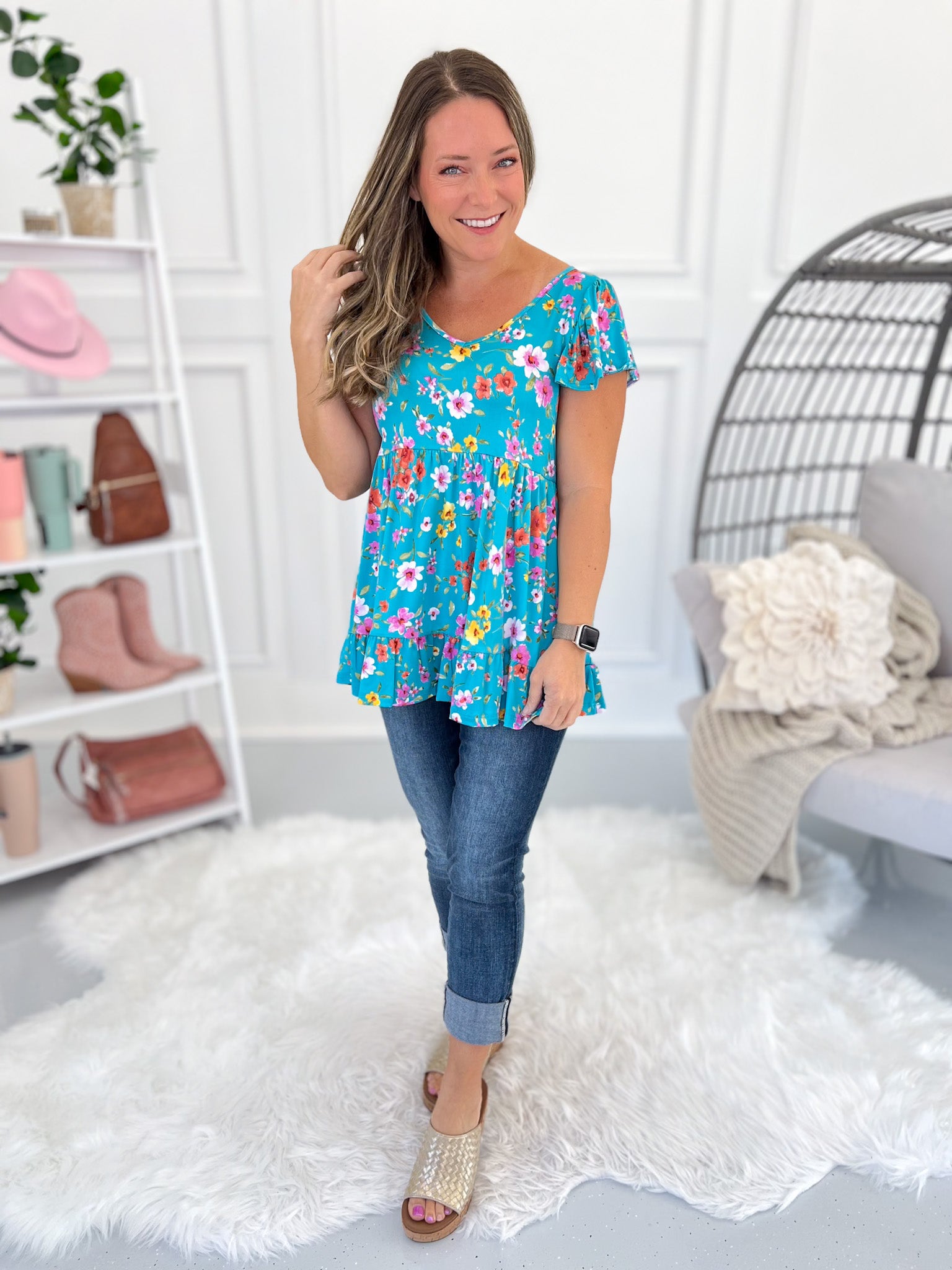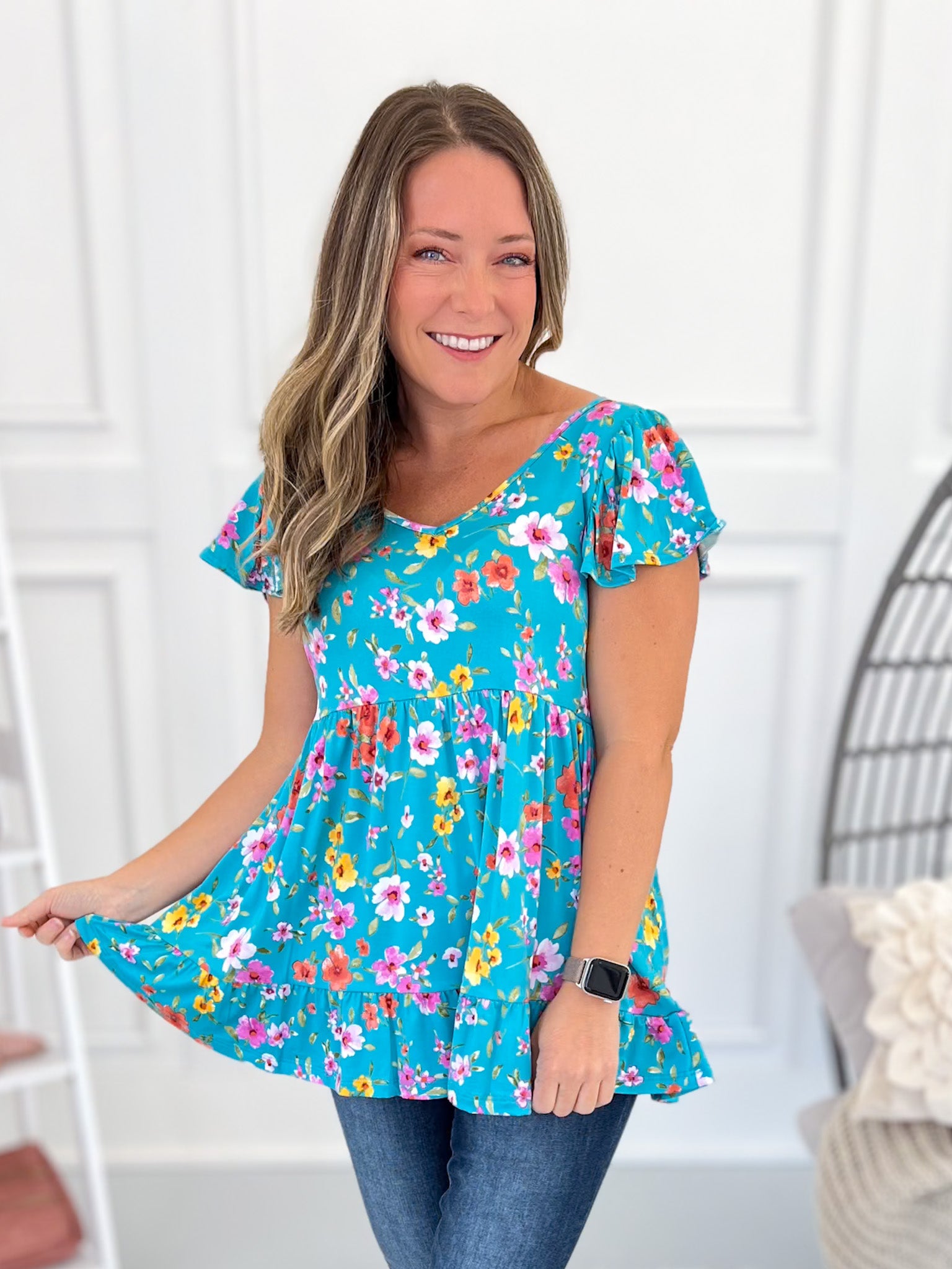 This floral babydoll top is all about effortless charm! With its buttery soft feel, flattering flowy fit, and sweet ruffle sleeves, it's perfect for dressing up your denim or keeping it casual with shorts. Whether you're headed to brunch or just feeling cute, this top makes it easy.