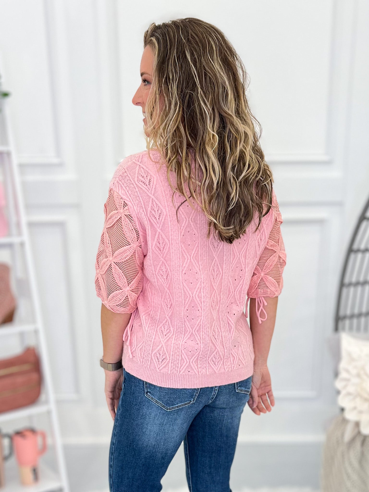 Soft, sweet, and just the right amount of detailed—our Smell The Roses Knit Top is one you’ll reach for again and again. With its dainty diamond knit, crochet-meets-mesh sleeves, and darling tie detail, this beautiful pink top brings charm to any look. Pair it with your favorite denim, white shorts, or flowy skirts for a look that feels just like spring.